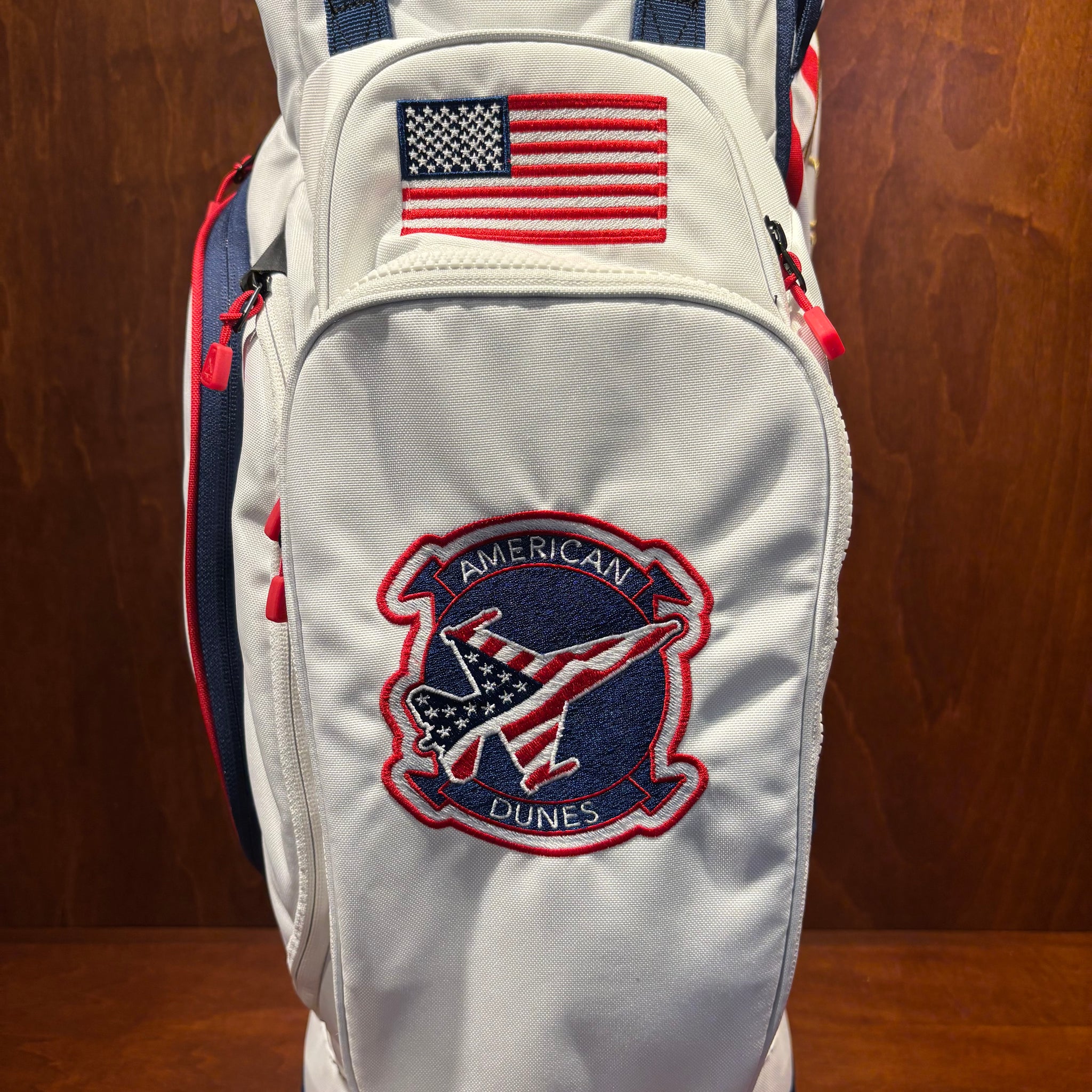 Bag features multiple logos, the American Dunes Fighter Patch on the ball pocket, and an American Flag on the accessories pouch.