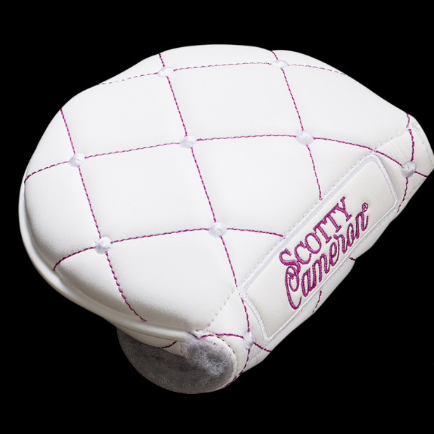 A stylish Pink & Pearls shaft ring anodized in bright dip pink accents an elegantly embroidered, diamond quilted patterned My Girl headcover, while a white Pistolini Plus grip complements a double bend stepless steel shaft for near-face balanced performance. A limited number of 2025 My Girl Pink & Pearls putters will be available in select Titleist golf shops.