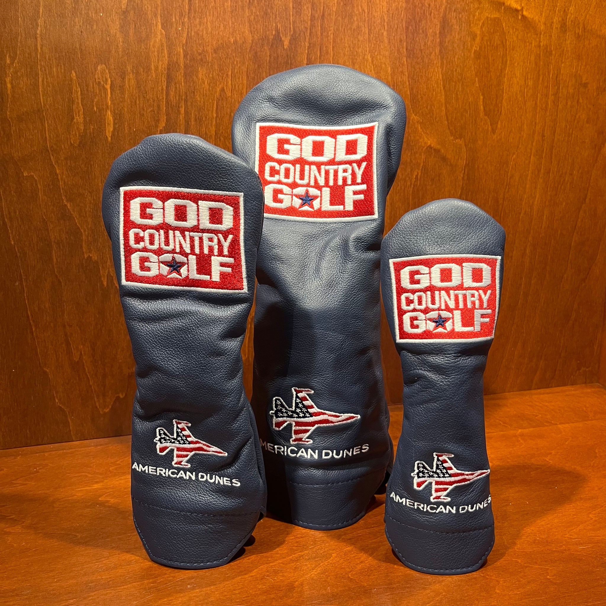 Headcovers made from American Leather, featuring embroidered "GOD. COUNTRY. GOLF" Logo and embroidered Patriot Jet Lockup Logo. Available in three sizes; Driver, Fairway, and Hybrid. Winston Collection Headcovers are proudly Made in the USA. Color: Navy/Navy.