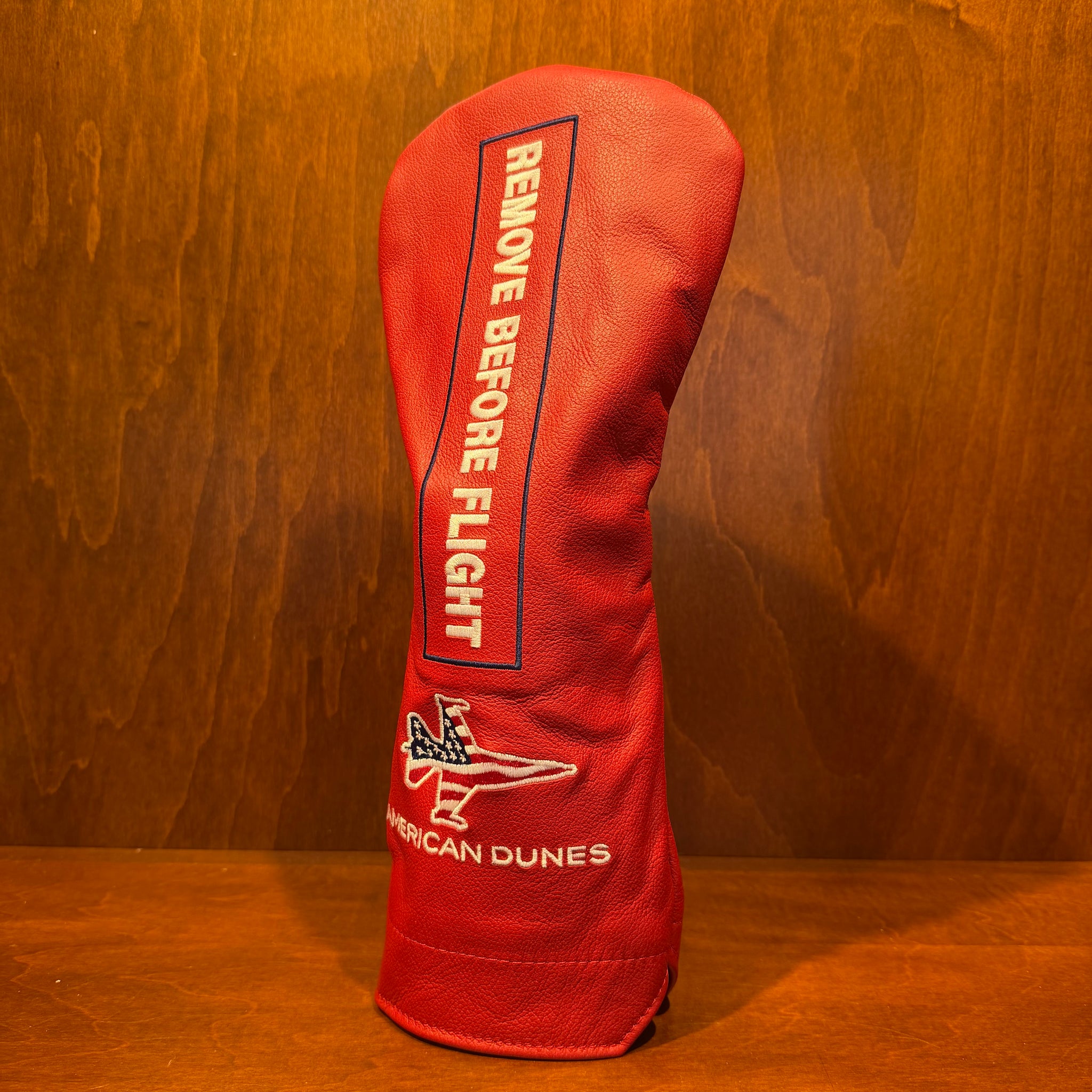Headcovers made from American Leather, featuring embroidered "REMOVE BEFORE FLIGHT" Text Logo and embroidered Patriot Jet Lockup Logo. Available in multiple sizes for Driver, Fairway and Hybrid. Winston Collection Headcovers are proudly Made in the USA. Color: Red/Red