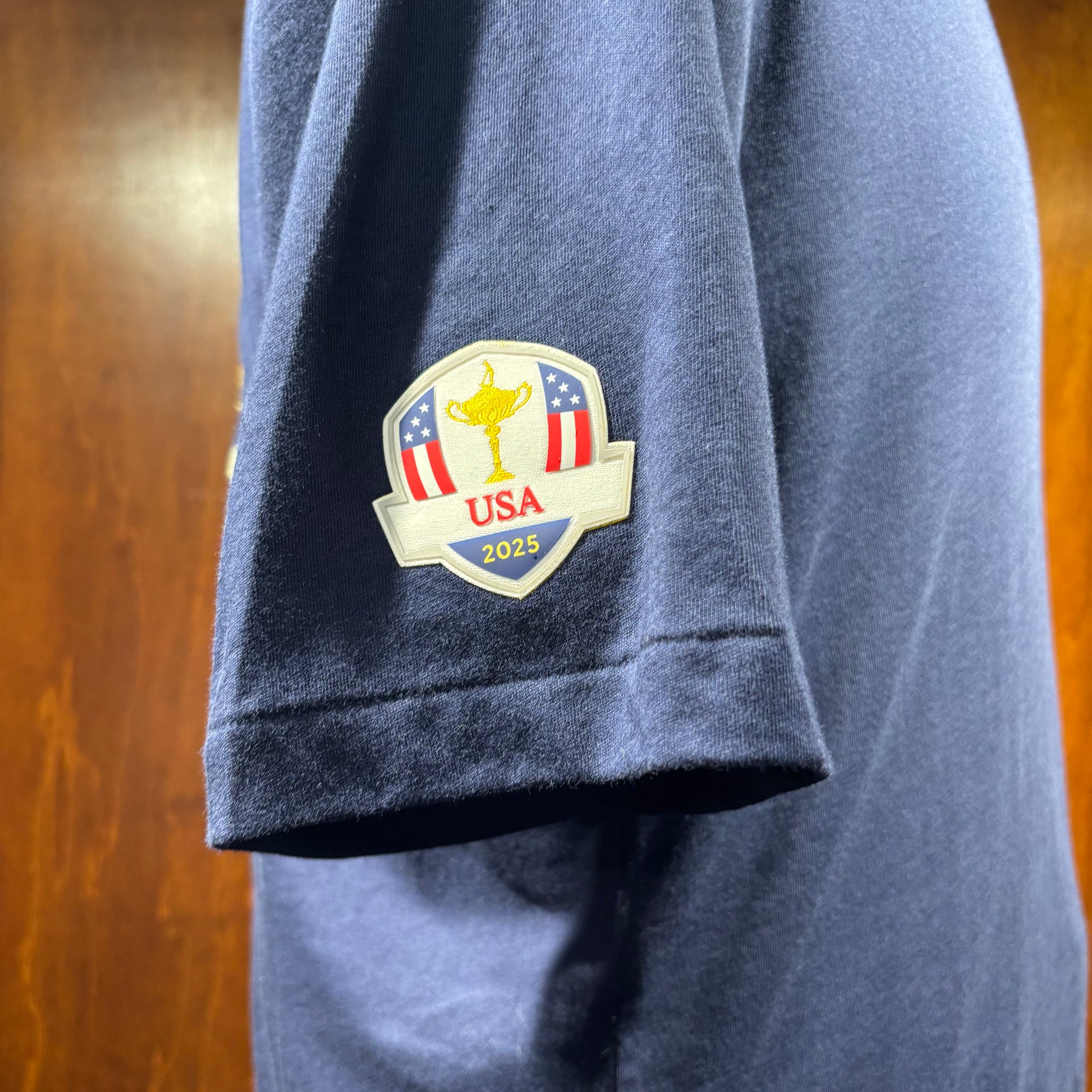 - "Ryder Cup 2025 U.S.A. Team New York" and the Ryder Cup trophy printed at the left chest. "Ryder Cup U.S.A. Team 2025," an outline of New York State with landmarks and stars printed at the center back.